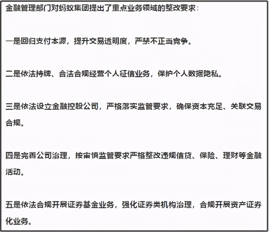 关于这个整改方案,在2020年12月26日,对蚂蚁第二次约谈里,就已经提出五大整改要求。