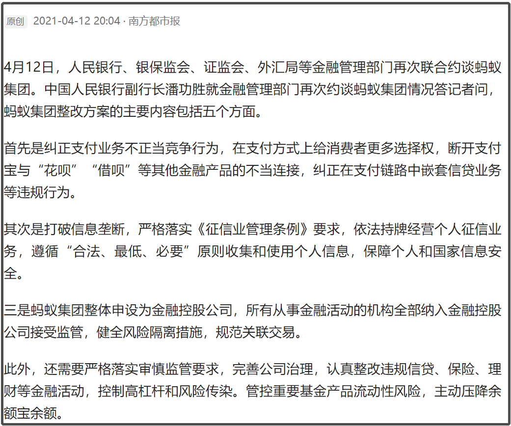 所以,我们对蚂蚁的这种监管和整改,还是比较及时,也是有必要的。