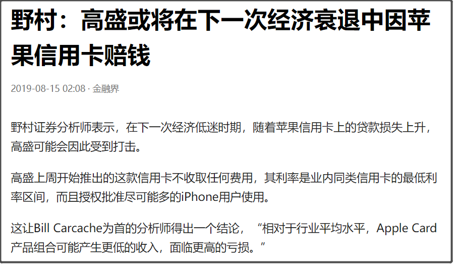 这个Apple Card是2019年推出的,当时刚推出时,就有一些大机构认为,高盛可能会在下一次经济衰退中,因为Apple Card赔钱。