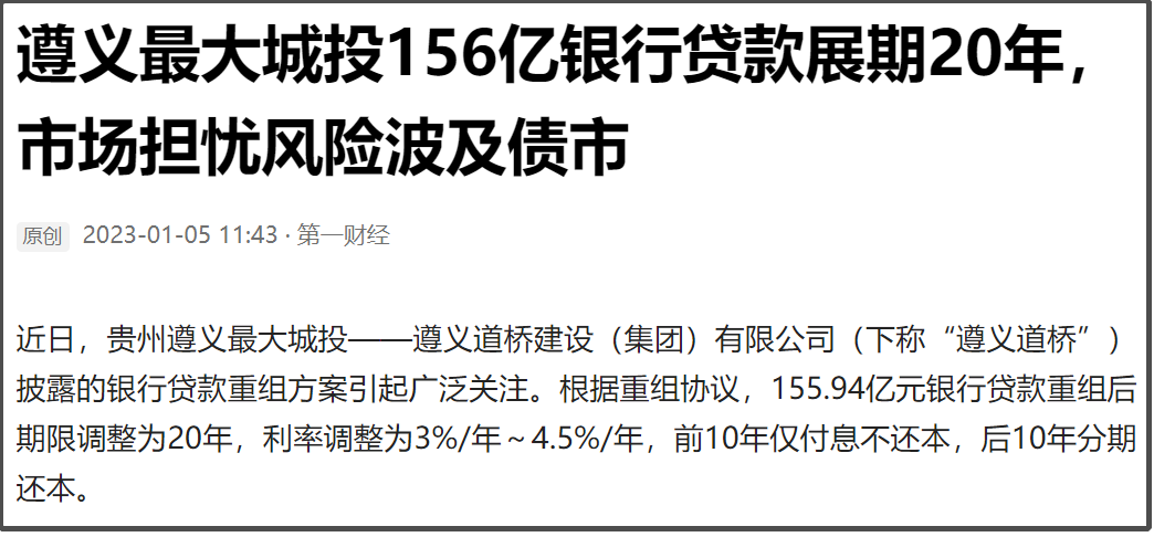 最近,贵州遵义道桥企业披露了银行贷款重组方案,155.94亿元的银行贷款展期20年,前10年仅付利息,后10年分期还本。