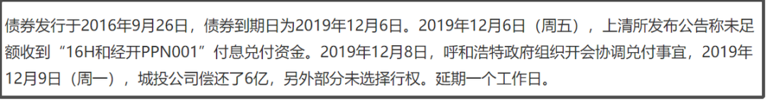 但后面,来呼和浩特地方的协调下,最终当时这个债券还是得到了协调兑付,晚了1天。