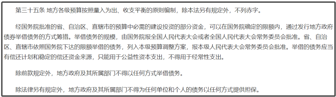 《预算法》第35条也明确规定了,除法律另有规定外,地方政府及其所属部门不得为任何单位和个人的债务以任何方式提供担保。