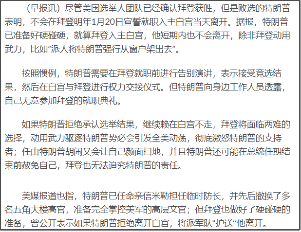 这个新闻大致是说,虽然12月14日美国选举人团已经投票确认拜登获胜,但特朗普仍然表示自己不会在明年1月20日拜登宣誓就职的时候离开白宫。
