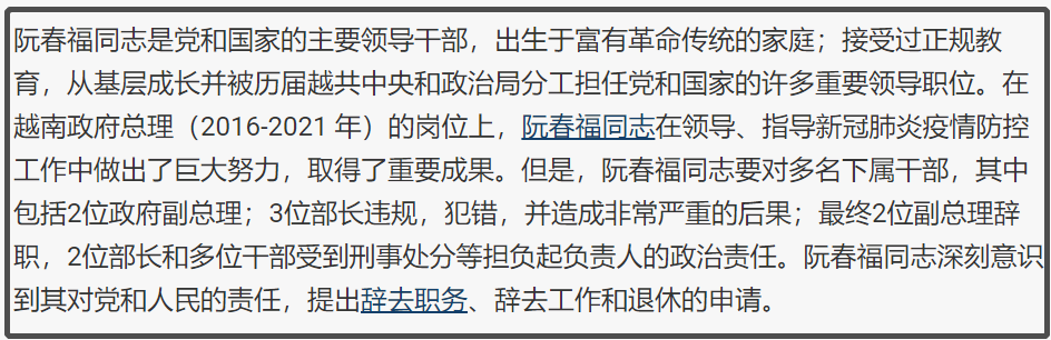 但其中也提到,越南2位副总理辞职,2位部长和多位干部受到刑事处分,阮春福对此担负起负责人的政治责任。所以,阮春福提出辞去职务、辞去工作和退休的申请。