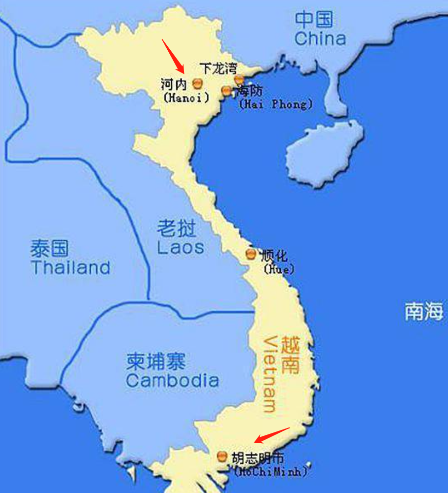 越南的地图是狭长型的,其中首都河内在北方,而越南的经济中心是胡志明市在南方。