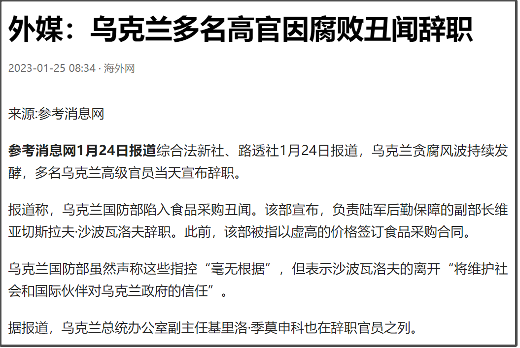 但最终乌克兰负责后勤的副防长还是选择“辞职”,乌克兰还要粉饰一下,坚称这些指控毫无根据,但仍然表示,这位副防长的离开“将维护社会和国际伙伴对乌克兰政府的信任”。