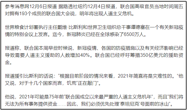 之前联合国高级官员曾经在联合国大会上说“明年年将出现人道主义危机”。