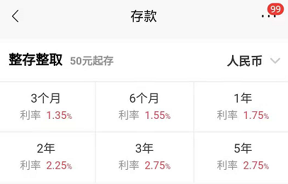 而一年期定期存款的利率才1.75%,两年期存款利率是2.25%。