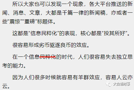 这种情况,如果我们平常日常所接触到的信息,都是一面倒的某一类信息,其实对于我们自身的独立思考,自我判断,是有很大障碍的。