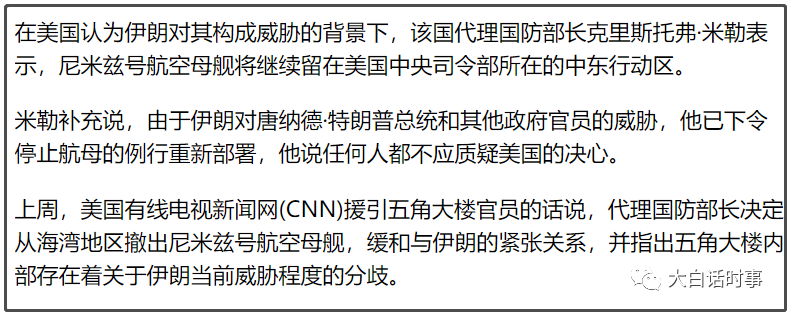 在此之前,12月31日美国的代理国防部长曾经做出决定将“尼米兹”航母撤离海湾水域,试图以此缓解与伊朗的紧张关系。