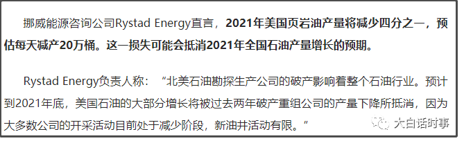 不过疫情的爆发,让国际油价出现暴跌,并重创美国的石油工业,直到现在美国股市里能源股整个板块仍然有35%的跌幅,并且美国的页岩油产业在去年有差不多1/4的企业破产,有机构预计2021年美国页岩油产量将因此减少1/4.