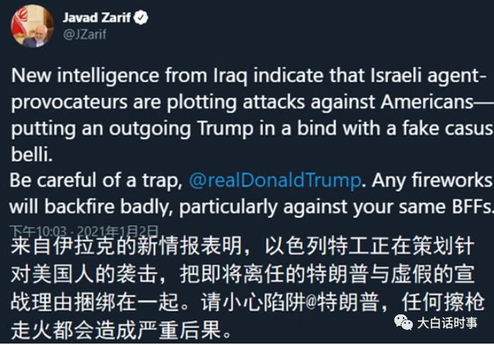因为就在伊朗外长发表这个信息之前,美国五角大楼和特朗普才刚指责伊朗可能在1月3日策划对美国的袭击。