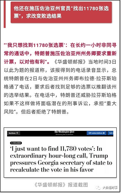 比如说,今天美国媒体泄露了一段特朗普跟佐治亚州州务卿通话的录音,这是一段长达一小时的通话。
