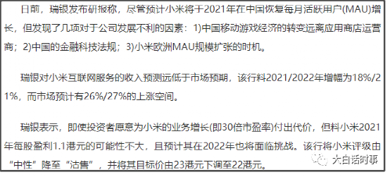 前几天瑞银曾经就下调了小米的目标价,下调到22港元。