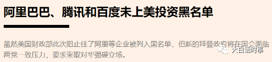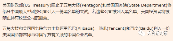 所以,在前两天,美国财政部极力阻止美国国防部把BAT三家企业拉黑的做法。