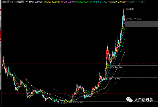 小米的股价从去年的3月份最低的9.2,一路涨到前段时间最高的35元,涨了将近4倍。
