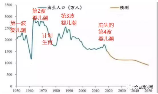 从上图看到,我们过去这么多年的每年出生人口情况,可以有3波比较明显的婴儿潮。