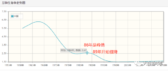 从上图可以看到,1986年的我国生育率是达到上一个峰值,然后从1989年开始就出现大幅度下降。