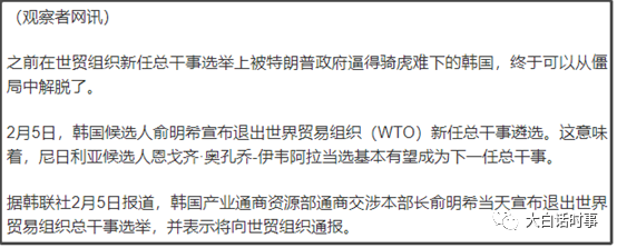 所以在俞明希2月5日宣布退出后,WTO总干事的人选就基本没有悬念,昨天也只是走一个例行公事的过程。