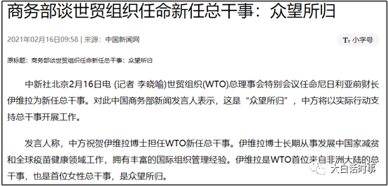 昨天WTO总算任命了新的总干事,并且是一名来自非洲的女性总干事。这是WTO成立以来首位女性总干事,也是首位来自非洲的总干事。