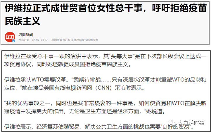 但拜登这个强烈支持,显得有点多此一举,因为这个时候WTO总干事的候选人也只剩下伊维拉一人,拜登想支持其他人也不行了。