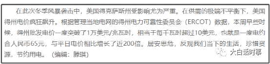 而由于德州的电力市场是进行市场化运作,在大面积停电的情况下,电力资源就显得格外宝贵,这也使得最近德州的电价也是疯涨,一度电涨到了10美元,也就是65元人民币,比平时电价涨了200倍。