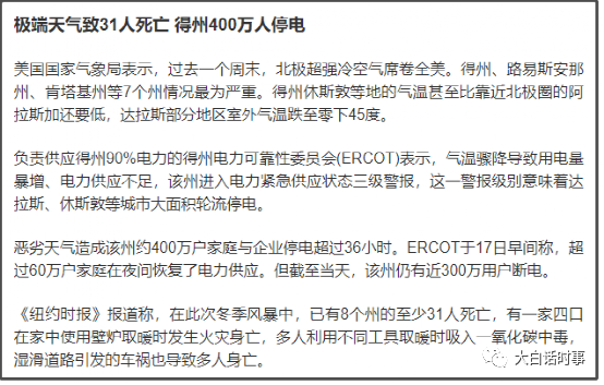 德州可是号称能源之都,是美国的石油和天然气工业中心,结果就是这样的能源之都居然还会停电,还断了供暖,简直让人匪夷所思。