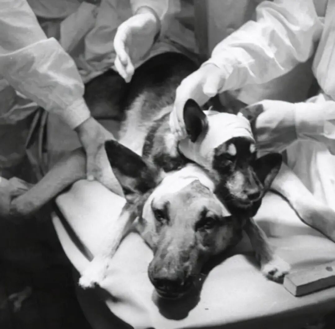 在德米科霍夫的科研生涯中,他进行过的最疯狂也最知名的一次实验来自于上世纪五十年代中期。在这次实验当中,德米科霍夫精挑细选了一只健壮的德国牧羊犬,在它的后脖颈处切开了一个口子。与此同时,他又将一只名为沙夫卡的小狗从前腿以下的部位进行截肢。