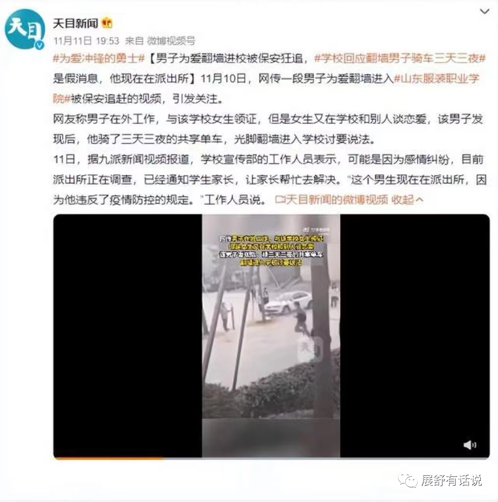 网上流传着这样一段视频,在山东服装职业学院的围栏处,有一名男子突然翻墙进来,正在被校内的一群保安追赶。
