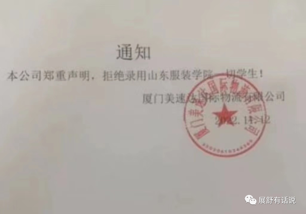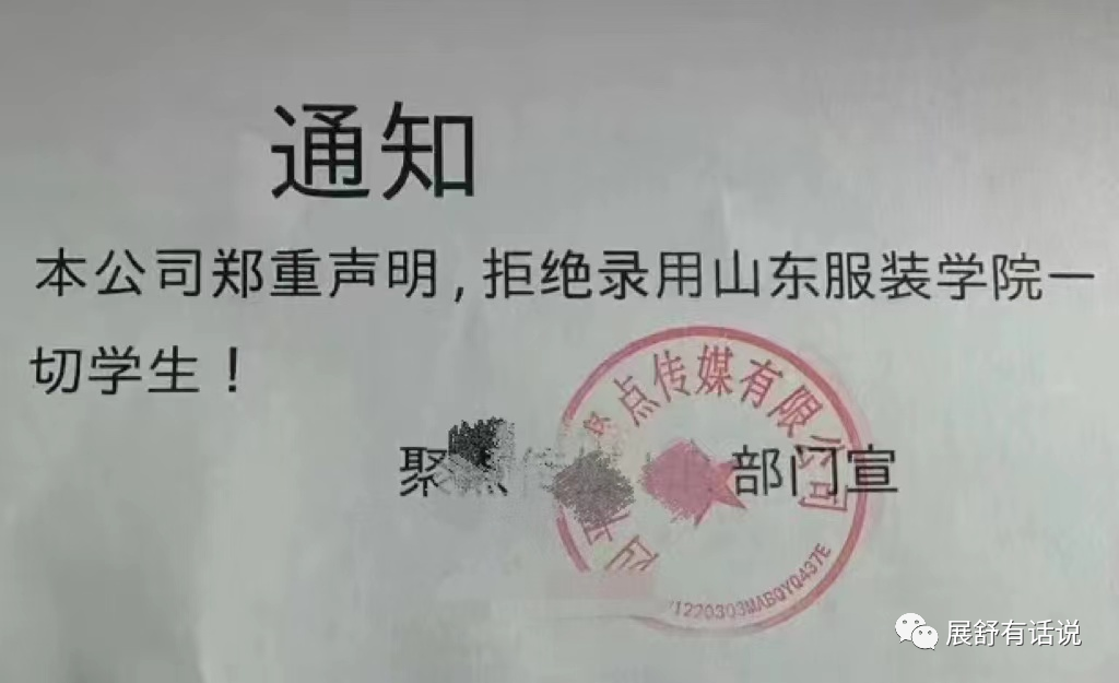 上面明确表示,拒绝录用山东职业服装学院的一切学生。