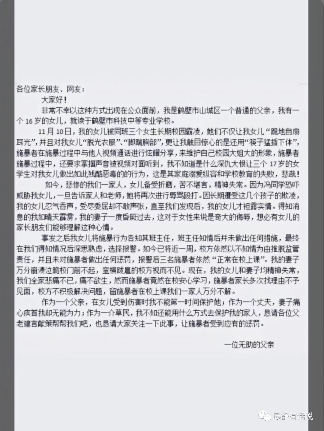 文章中,一网友以父亲的身份控诉,称女儿被长期霸凌欺辱,遭到几名女生“跪地自扇耳光”、“脱光衣服”、“猛踹胸部”的暴力侵犯。