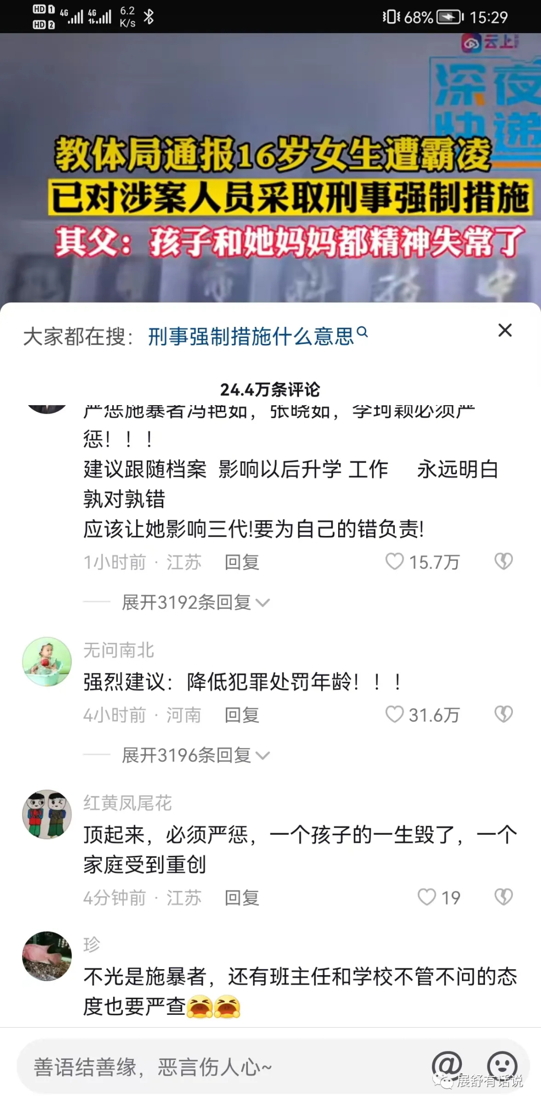 有网友在网上发出了深深的叹息,担心事件一出,施暴者们会反变成受害者,遭受网络暴力,说,“她们都还是孩子,也不必如此赶尽杀绝吧。”
