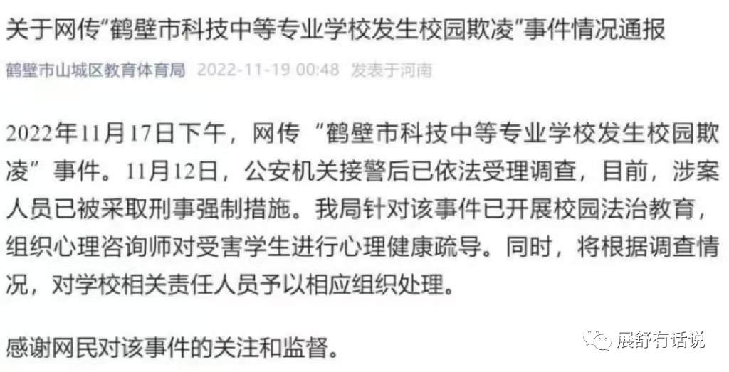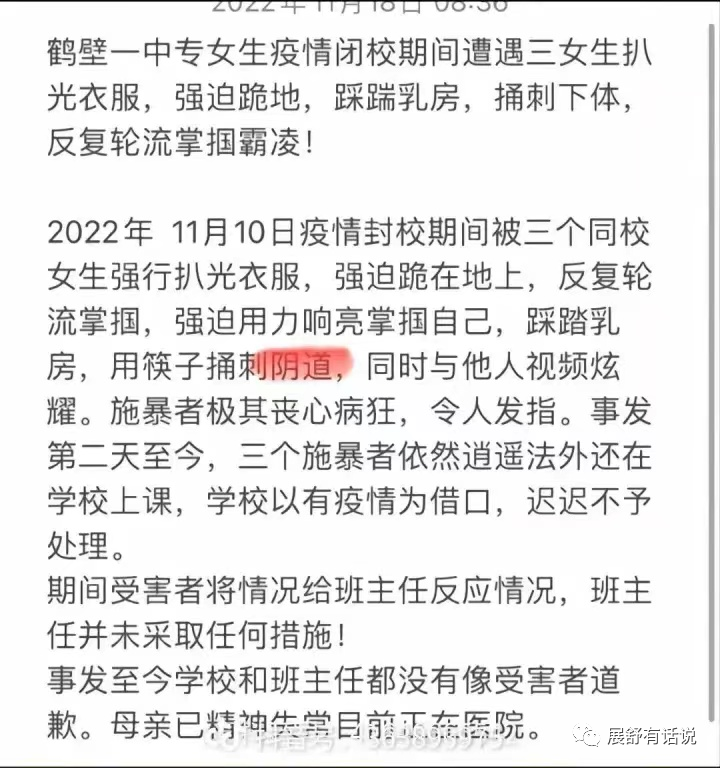 11月18日,河南鹤壁一则中专女生遭遇校园霸凌的文章引起网友关注。