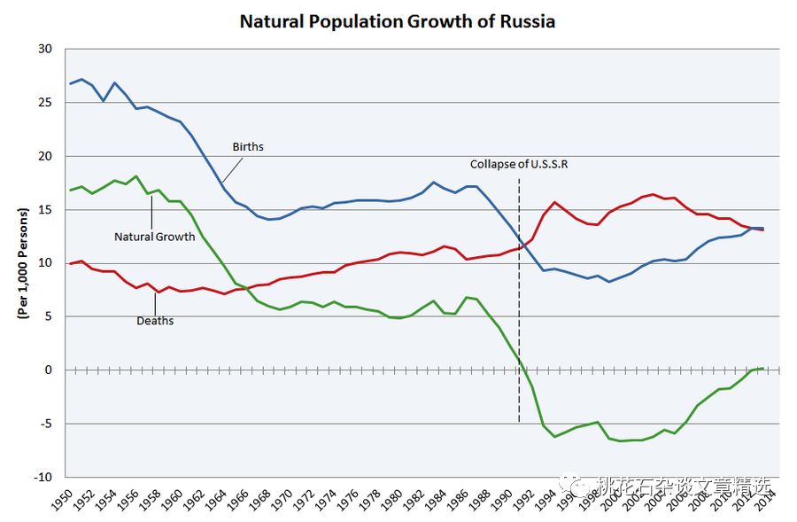 俄罗斯人口出生率与死亡率统计图,红色是死亡率,蓝色是出生率,中间的竖虚线标志的是苏联解体,可以清楚地看到苏联解体后俄罗斯人口出生率骤降,死亡率暴涨的过程