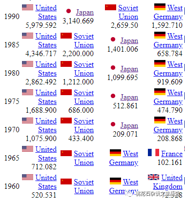 1960年到1990年全球GDP排名,可以看到苏联在勃列日涅夫(到1982年)治下始终稳居第二,而且经济增长始终不算慢