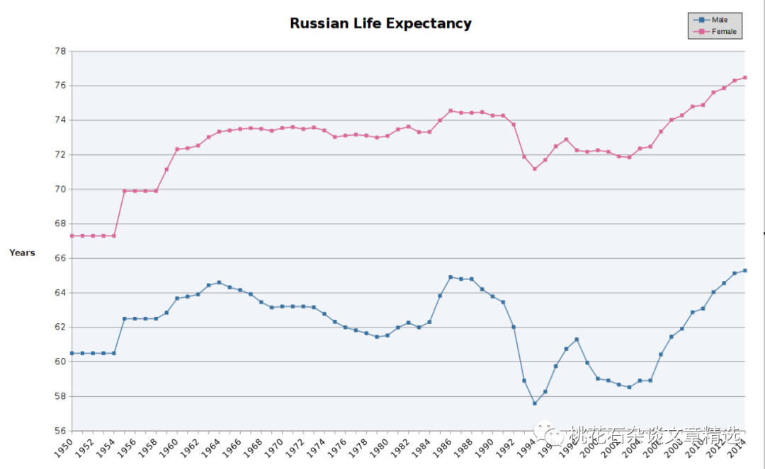 (俄罗斯的人均预期寿命从1950年到2014年变化的情况,蓝色为男性人均预期寿命,红色为女性人均预期寿命,可以清楚地看到从1991到1994年的暴跌,特别是男性从65岁左右暴跌到57岁多)