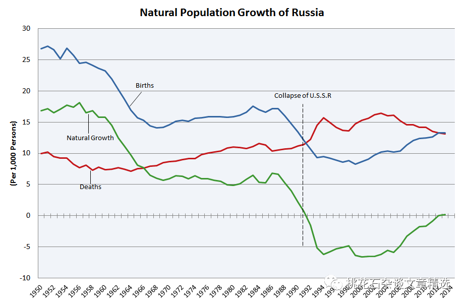 (图为1950到2014俄罗斯人口变化情况,红线为人口死亡率,蓝线为人口出生率,中间竖虚线为苏联解体的时间,可以清楚地看到苏联解体之后俄罗斯人口死亡率暴涨,出生率暴降的过程)