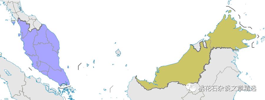 (马来西亚,左边蓝色区域为早先独立的马来亚,右边棕色区域是1963年加入马来西亚的沙巴(上)和砂劳越(下))