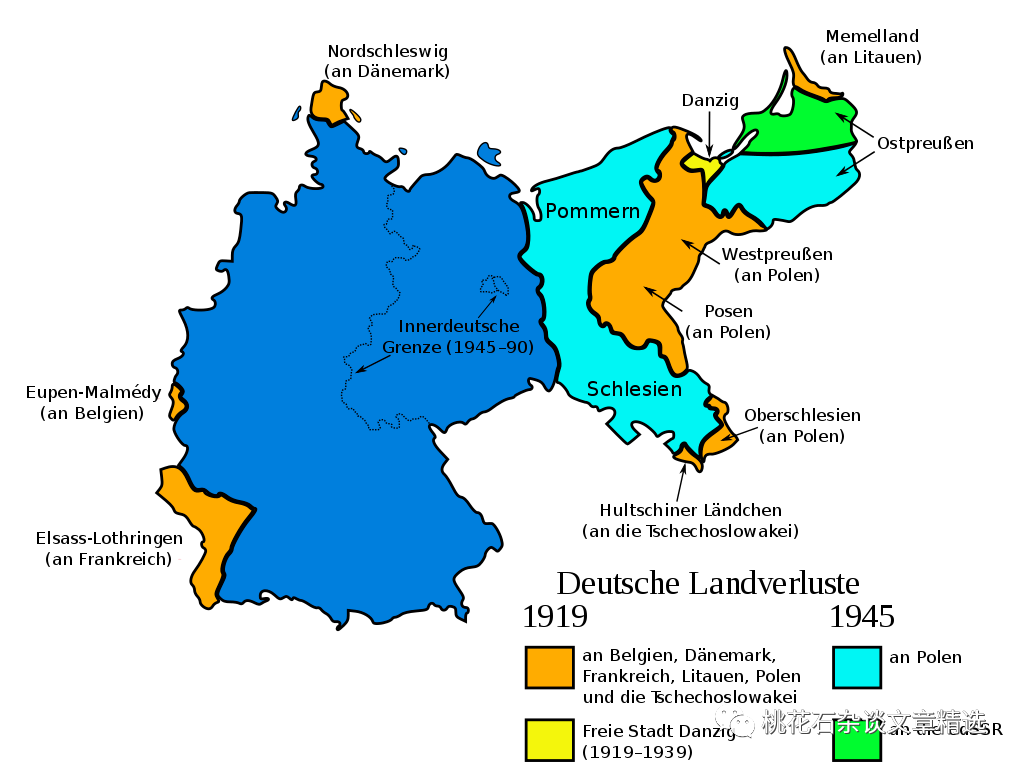 (德国在两次世界大战中的领土损失,其中除淡蓝色区域外基本都是二战后损失的)