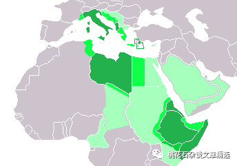 (鼎盛时期的意大利殖民帝国(深绿),其中埃塞俄比亚(下方内陆区域)为二战前占领,其余在一战前就已占领)