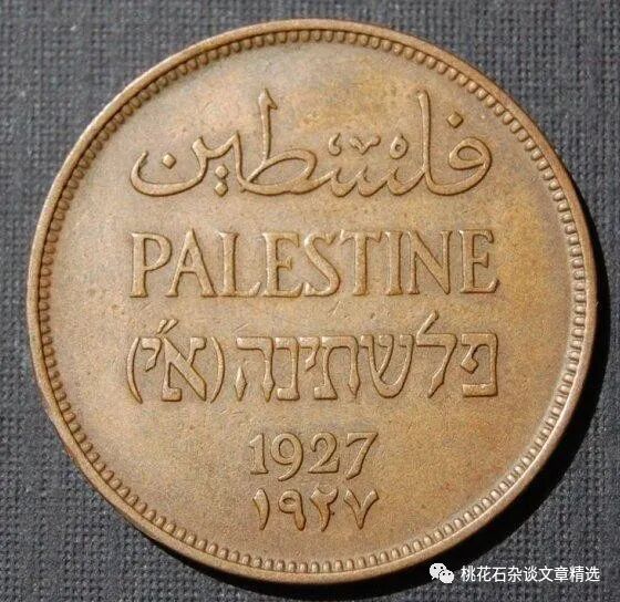 英属巴勒斯坦的钱币,上面刻有英文和阿拉伯文的“巴勒斯坦”以及希伯来文的“以色列”