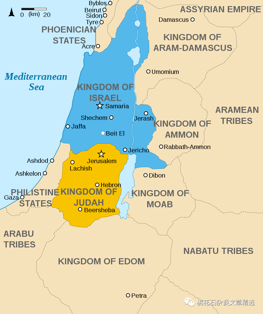 而另外两个以色列部落则独立成为了犹大王国,其控制区域主要位于今天的耶路撒冷周边。他们的王国之所以被称为犹大王国,是因为组成这个王国的两个部落当中,有一个被称为犹大部落,而这个名称是以色列(雅各)一个儿子的名字。根据宗教记载,犹大这个单词最初的意思可能是“赞美”。但根据一些近代学者的考证,犹大最早更可能是当地一条山涧的名字。而犹太人(Jews)这个称呼源自古希伯来语的单词“耶胡迪”(Yehudi),意思就是犹大部落或犹大王国的人。