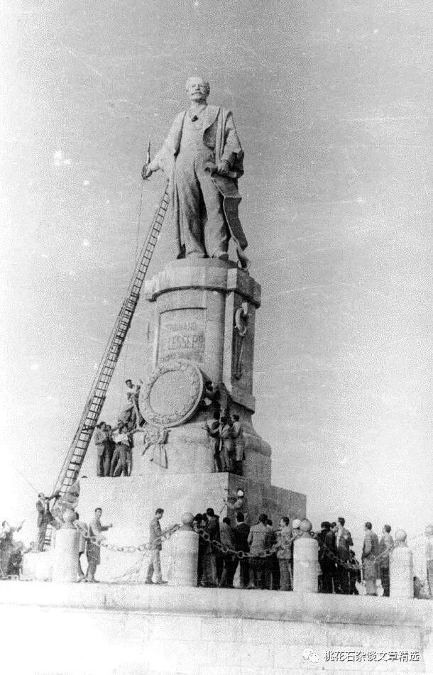 埃及人推倒苏伊士运河建造者法国人德·雷塞布塑像场景