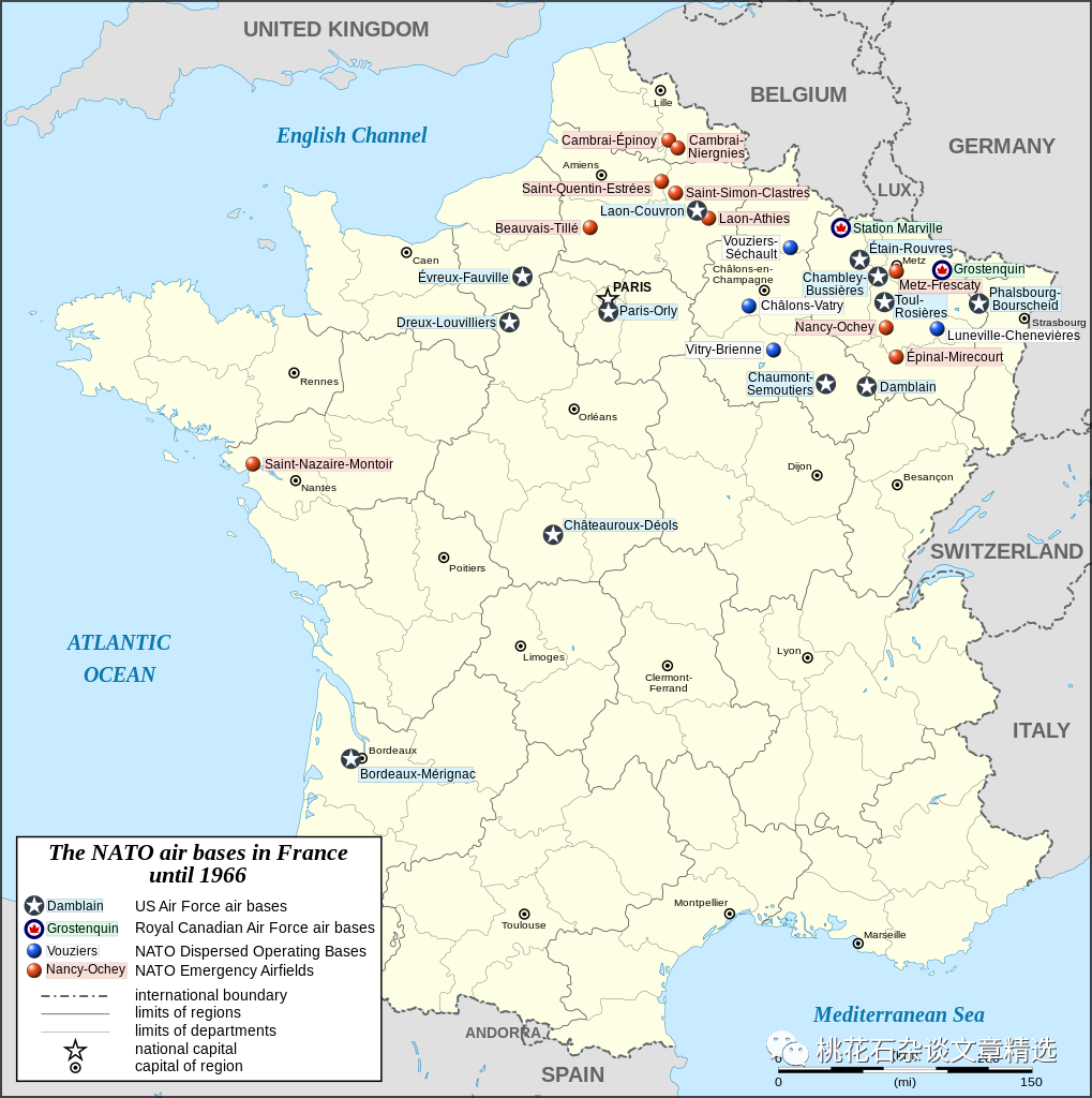 1950年,法国同意了美国在其境内建立军事基地,在此后的10多年间,美国先后在法国境内建立起了11座大型空军基地。包括F100D和C-130A等美国空军的先进战斗机与运输机都曾被部署在法国的军事基地内。此外,美国陆军在此期间也曾在法国部署了相当数量的军队。而北约的欧洲盟军最高司令部也设在了法国首都巴黎的凡尔赛镇。可以说在二战结束之后,美国在法国境内设立的军事基地是其欧洲军事部署的核心环节,法国在北约内部也与美英一同组成了三巨头。