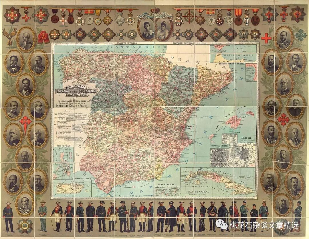公元19世纪末描绘西班牙及其最后殖民地的地图,右下角即是古巴