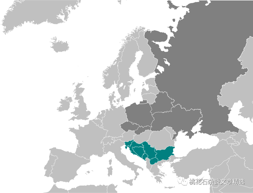 (历史上的南斯拉夫人分布区域(绿色),图中灰色区域为其它斯拉夫民族分布区)