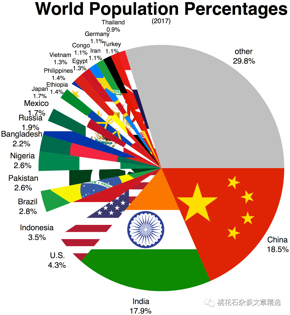 而上面这张图在某种意义上更加直观一些,它显示的是几个人口大国在世界人口里的占比。中国目前的占比是18.5%,而印度则也达到了17.9%左右,第三就是美国。所以从这张图里也能看出一些各国在国际上的影响力情况和未来的发展潜力。不过要说明的是,因为不同数字的统计口径和时间不一样,因此本文里几个图表的数字和比例并不能完全对应,但具体相差不会太大,大家从中已经可以了解世界各国人口的分布情况了。