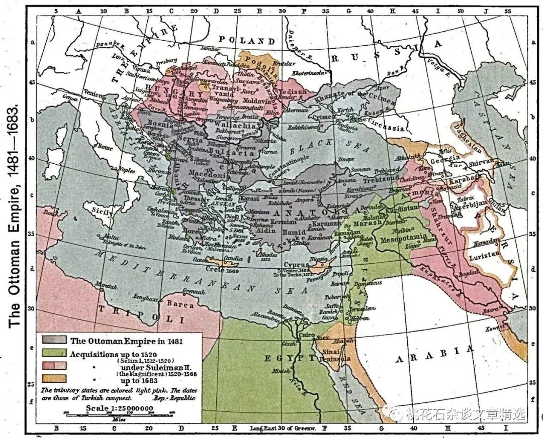 (奥斯曼帝国,中间灰色区域是公元1481年的疆域,也就是灭亡东罗马后不久的疆域)