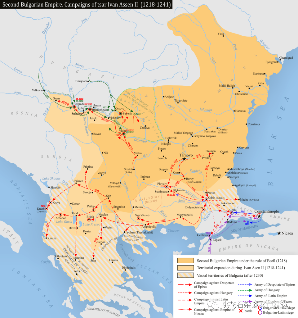 保加利亚这个国家可以说是源自公元632年建立的保加利亚第一帝国(大保加利亚)。而建立大保加利亚的族群是保加尔人,这个族群可能是公元4世纪进入欧洲的亚洲游牧族群匈人的支系。但在大保加利亚建立之后,保加尔人很快被周边的斯拉夫人同化,转变成了一个南方南斯拉夫民族。在公元9世纪,保加利亚在东罗马帝国的打击也不断衰落,最终在公元1018年被东罗马灭亡。但在公元1185年,保加利亚人发动起义,成功复国,建立保加利亚第二帝国并在公元13世纪上半叶达到鼎盛,其疆域覆盖今天的罗马尼亚、乌克兰、希腊和巴尔干诸国部分领土,领土面积达到47万平方公里。但此后保加利亚在西征蒙古军队和东罗马帝国的打击下逐渐衰落,在公元1330年沦为塞尔维亚的附庸,后又被奥斯曼统治,直到公元1878年才复国成功。现代保加利亚领土面积为11万平方公里。