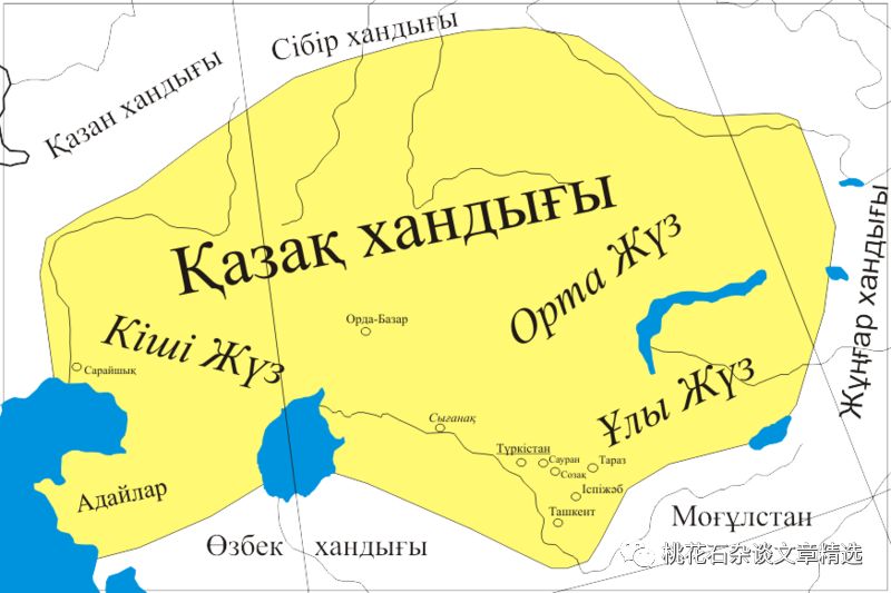 后来虽然哈萨克汗国由阿布赉(lài)汗重新统一,但准噶尔的入侵直到公元1745年准噶尔被清朝完全攻灭之后才得以改变。而在当年,阿布赉向清朝称臣,但同时也向沙俄称臣,哈萨克汗国和当时的琉球国一样出现了两属的情况。